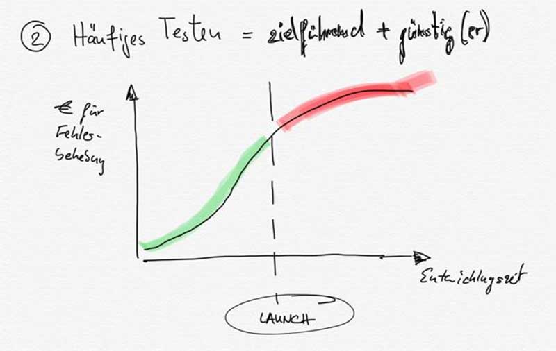 • Es ist bewiesen, dass Veränderungen am Produkt nach dem Launch deutlich teurer und aufwändiger sind als noch in der Entwicklungszeit. Bei manchen Produkten kann man nach dem Launch überhaupt nichts mehr machen. Hierzu gibt es Kennzahlen und vermutlich auch Erfahrungswerte in Ihrem Unternehmen. Diese sollte man alle zusammentragen, um zu erläutern, dass ein Test im Vorfeld vielleicht 10.000 Euro kostet, aber eine Anpassung des Produkts nach dem Launch zu schlechter Kundenzufriedenheit, viel Arbeitsaufwand, Frustration und Arbeitsstunden von bis zu 100.000 Euro führt.